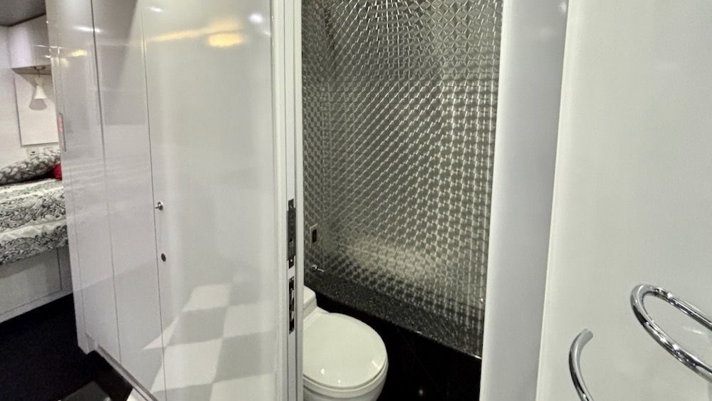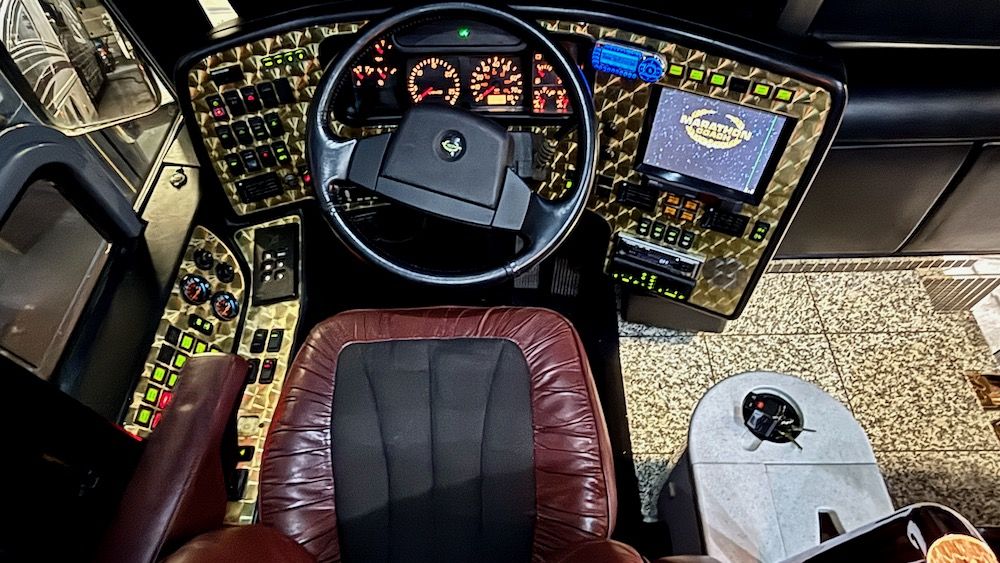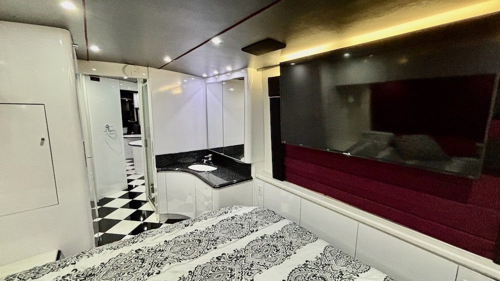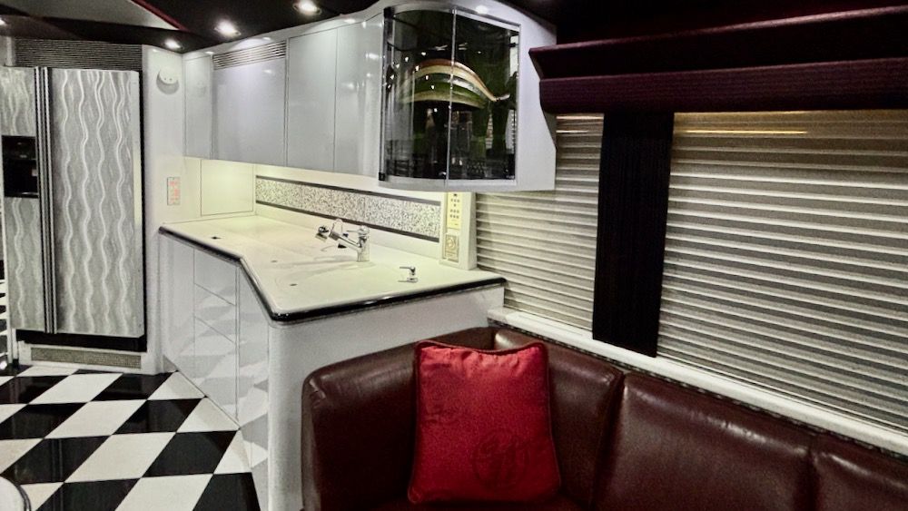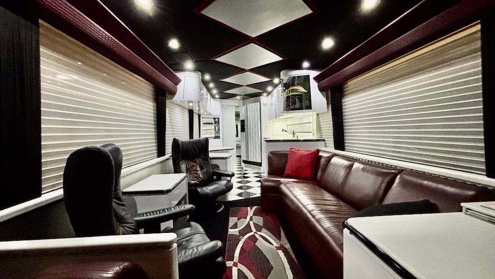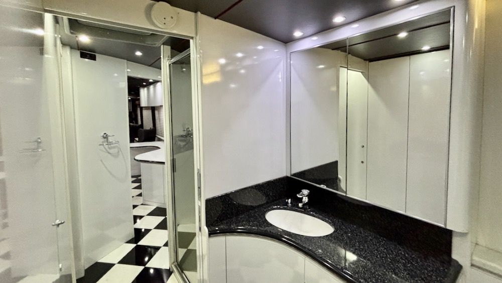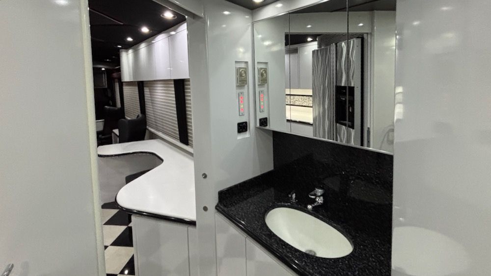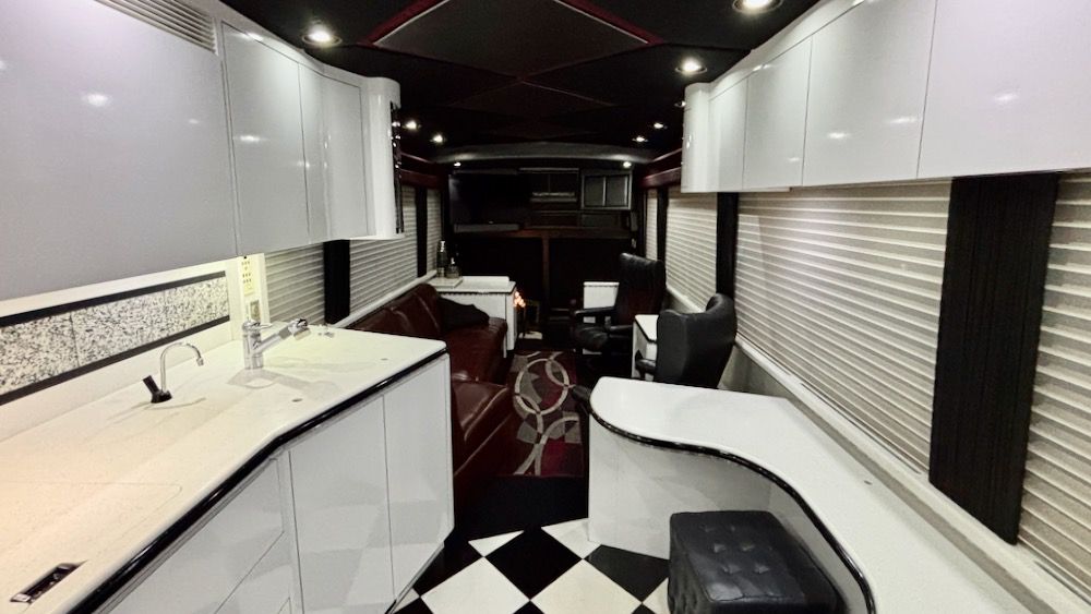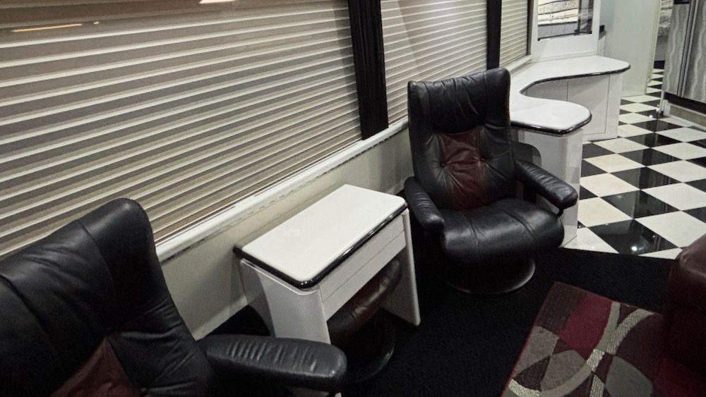 This very unique Marathon H3-45 features OTR Bus A/C, 4-CruiseAirs, 20KW turbo genset, 2-4,000 watt Trace inverters, Webasto diesel heat/hot water, updated smart TV's and so much more!. This beautiful, contemporary coach is finished in a mixture of machine turned metal, black leather, checkered porcelain tile, a soft dove gray laminate. This coach includes a private water closet, stacked W/D, 2 vanity sinks, a breakfast bar (currently fitted with 2 cushions, could be changed tob stools or chairs), an angled sofa, and 2 recliners. The coach also has a large outdoor flatscreen TV, power Girard awning, and more. Please contact us to learn more about this very special Marathon Coach.