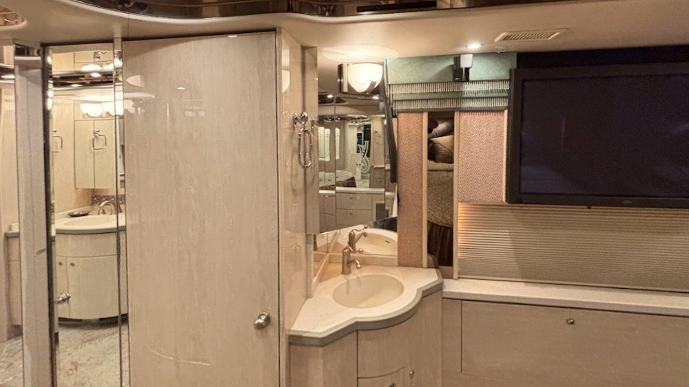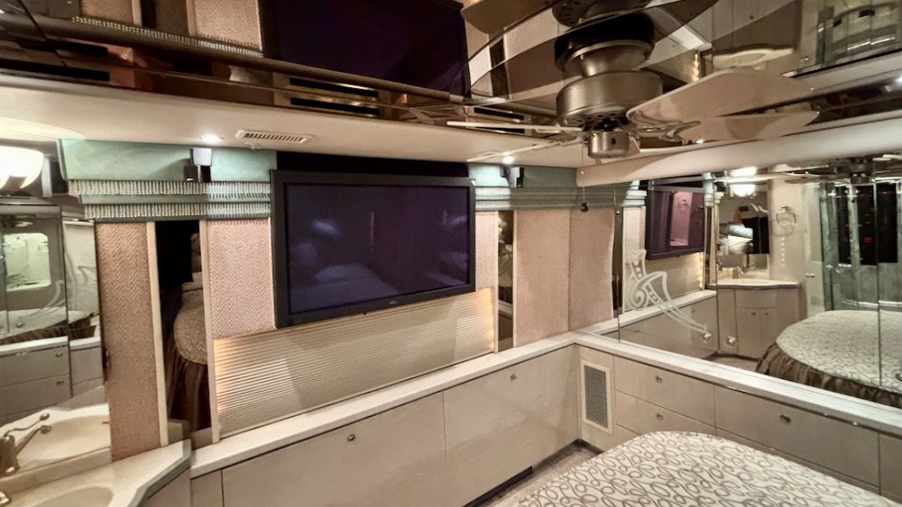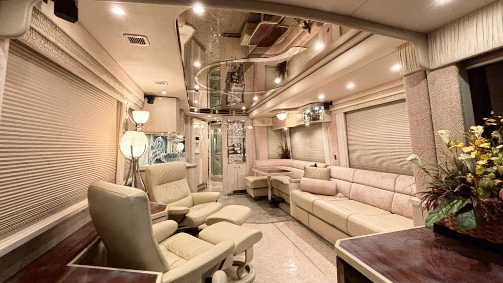 Beautiful, very low mileage (70K!) Prevost Featherlite Vantare with OTR Bus A/C, 4 Cruise Airs, AquaHot, 2-4,000Watt Inverters, 2 roof top Girard Awnings, and more! This very nice coach includes a stacked W/D, power sofa bed, power extendable dinette & dining table, swing down salon TV, 2 leather recliners, light neutral colors throughout. Please contact us to learn more about this wonderful luxury coach.