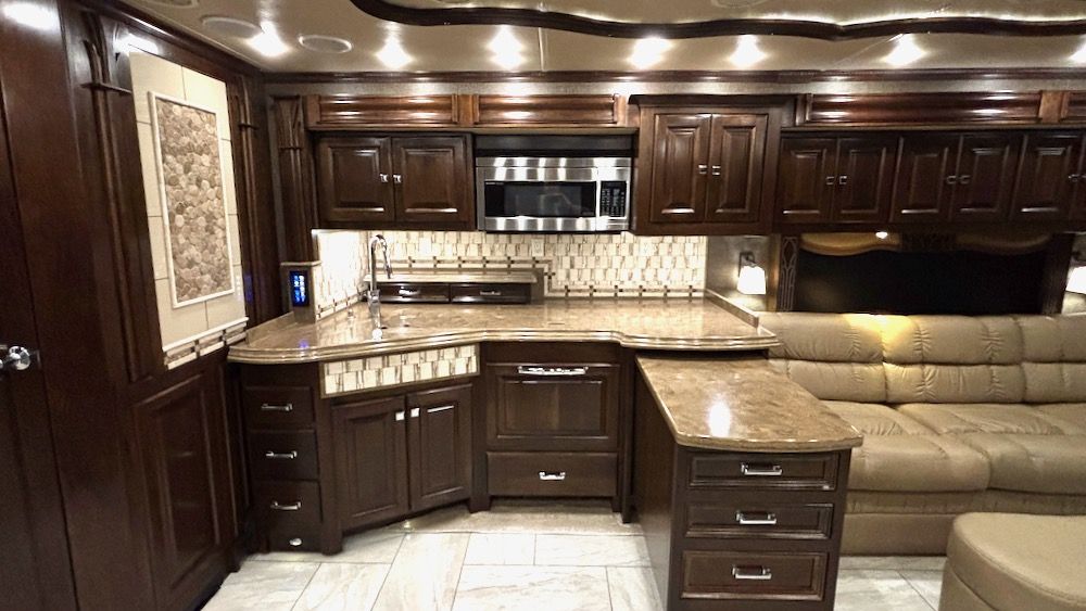 leveling, basement refrigerator, stacked W/D, dishwasher, Wolf induction range , mobile eye collision avoidance and more. This stately coach is built on the Powerglide chassis with independent front suspension and is powered by an ISL 450HP Cummins, mated to the 6 speed Alison transmission, and includes a 2 stage "Jake" brake. Please contact us to learn more about this fantastic coach that was always stored undercover.