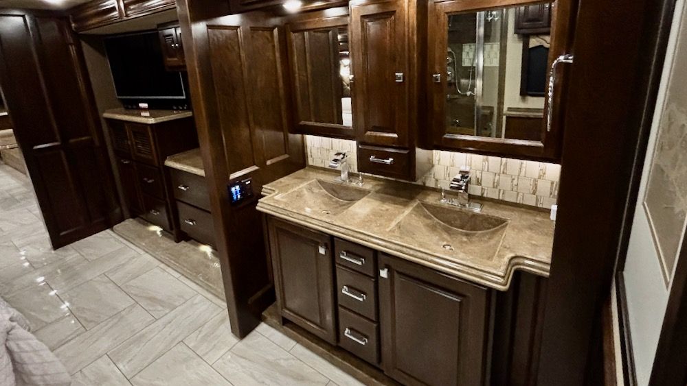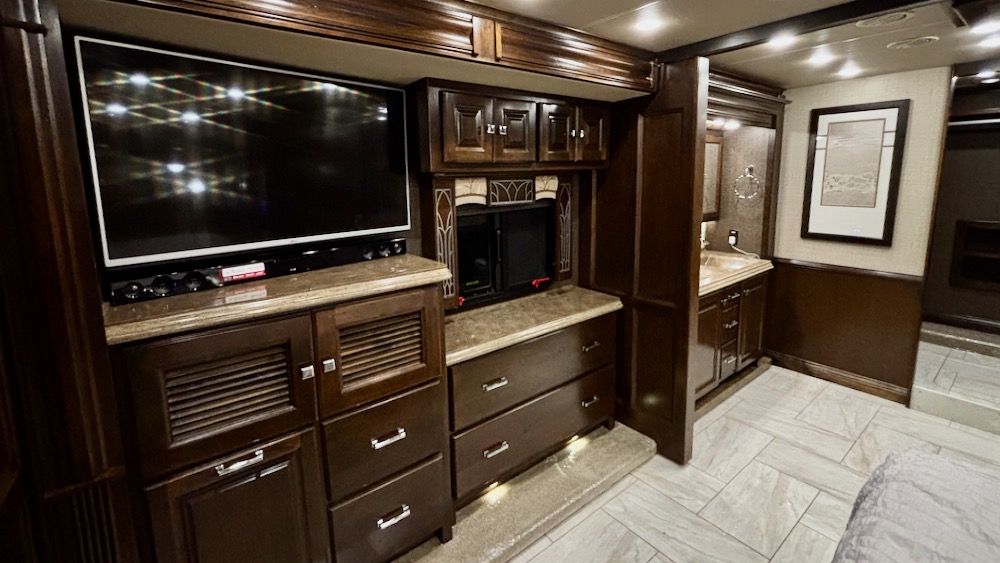 Low mileage, exceptionally nice, bath & 1/2 Tiffin Allegro Bus! This beautiful coach features double "bat wing" patio awnings, 10KW generator, 3 roof top A/C's w/heat pumps, heated floors, electric fireplace, AquaHot, 2 power 2-way sliding bay trays, exterior entertainment, and so much more!. This wonderful coach also features a King bed, 2 vanities with double sink in aft lav, large shower, 4 large flatscreen HD TV's, computer hydraulic & air